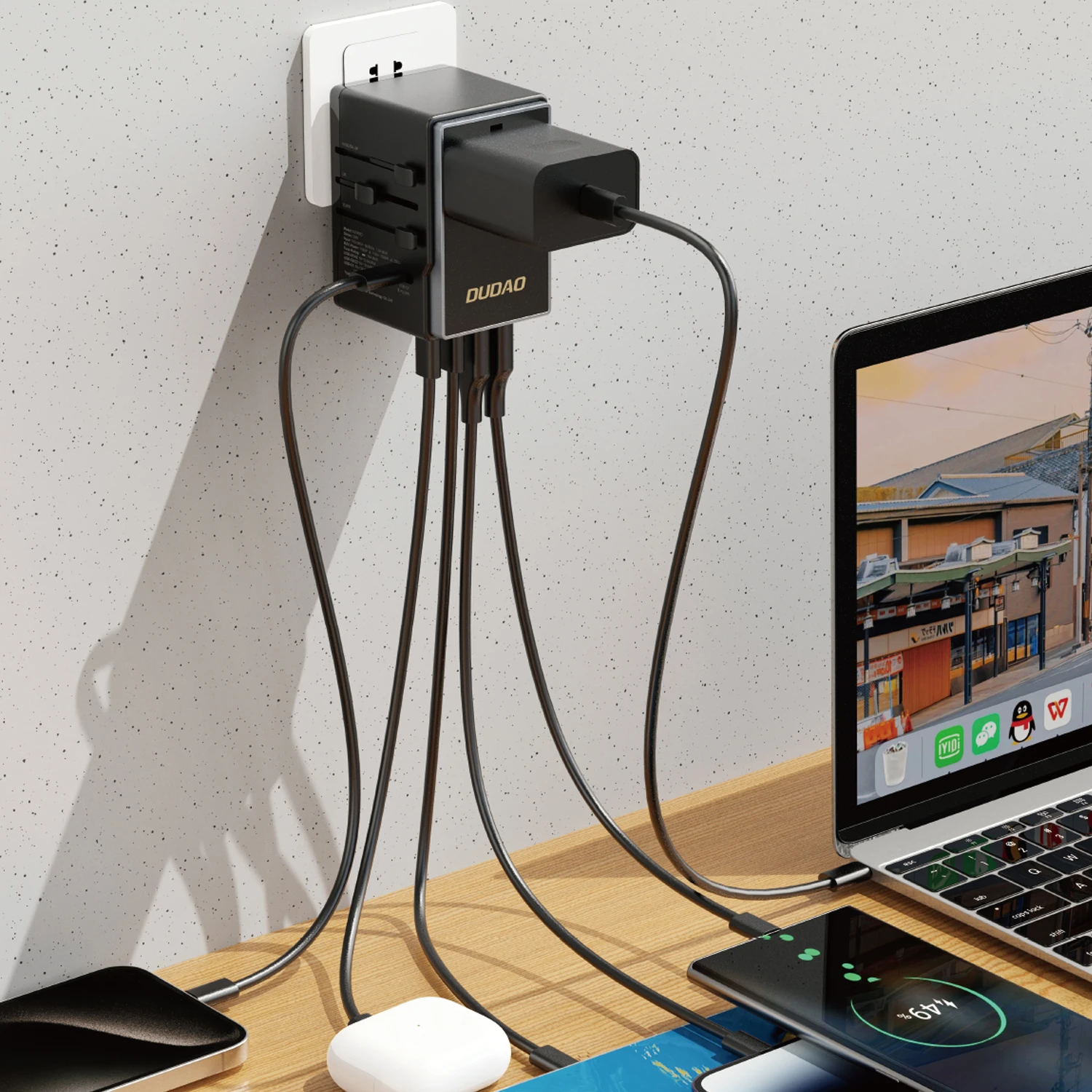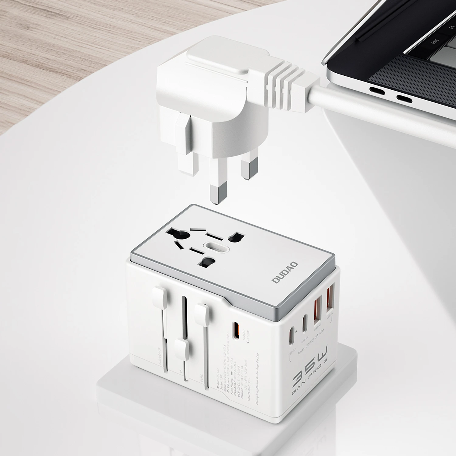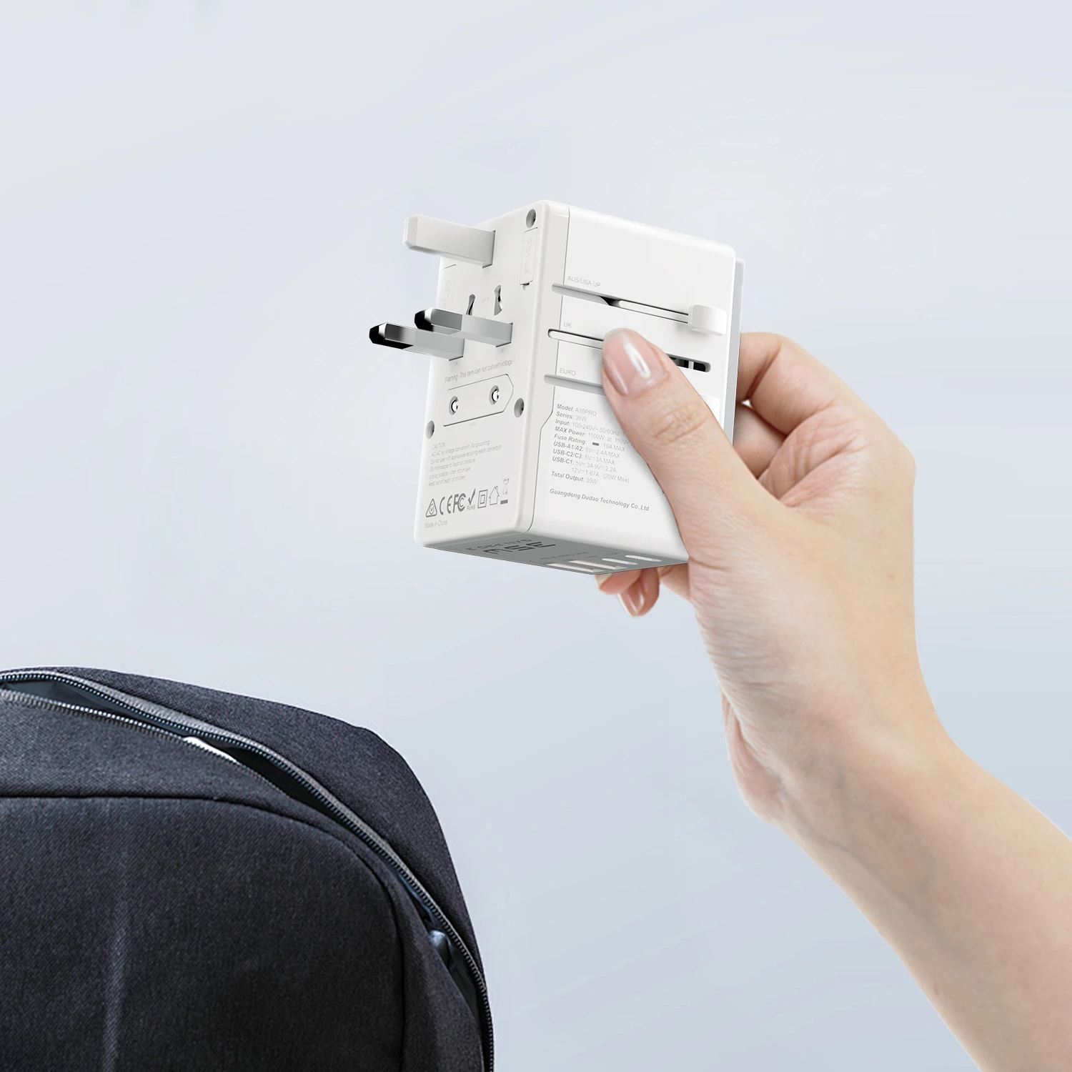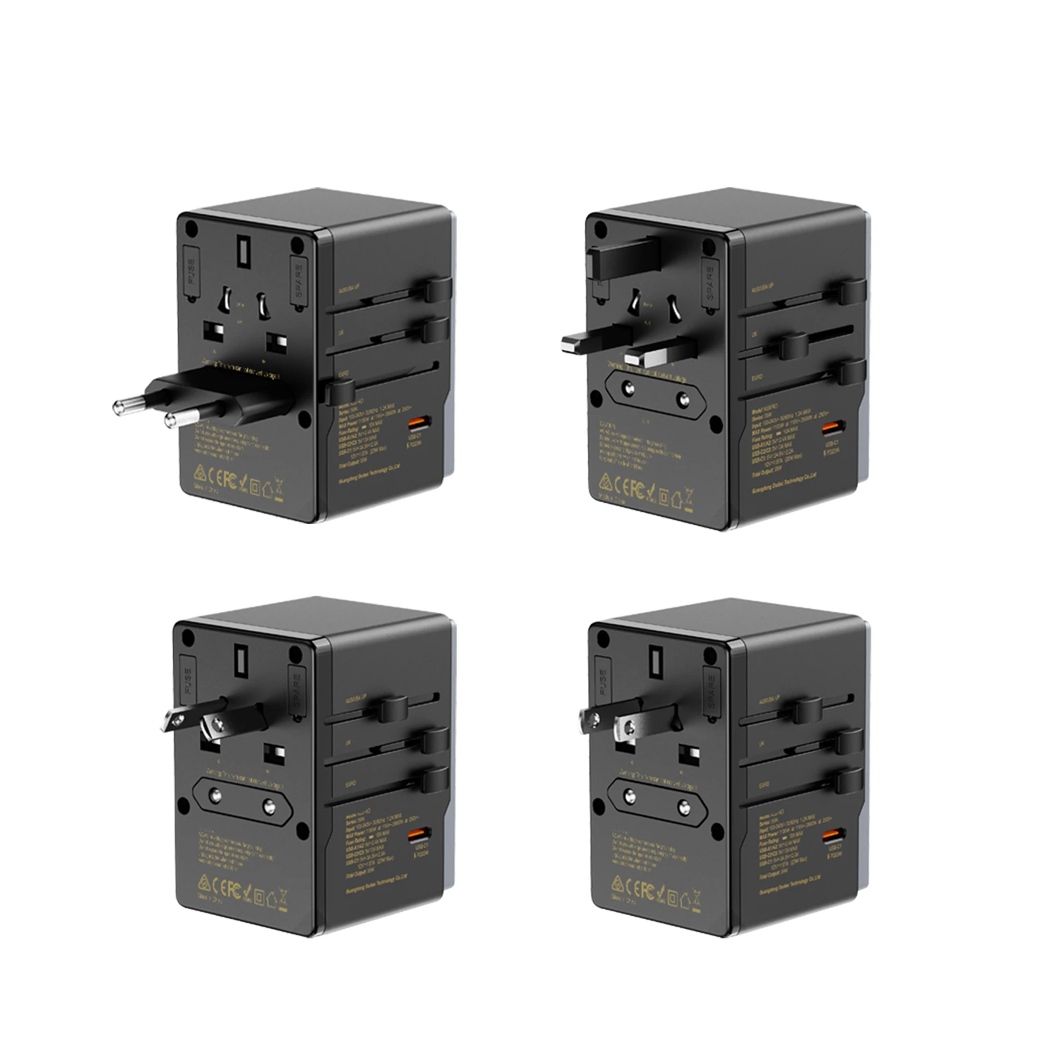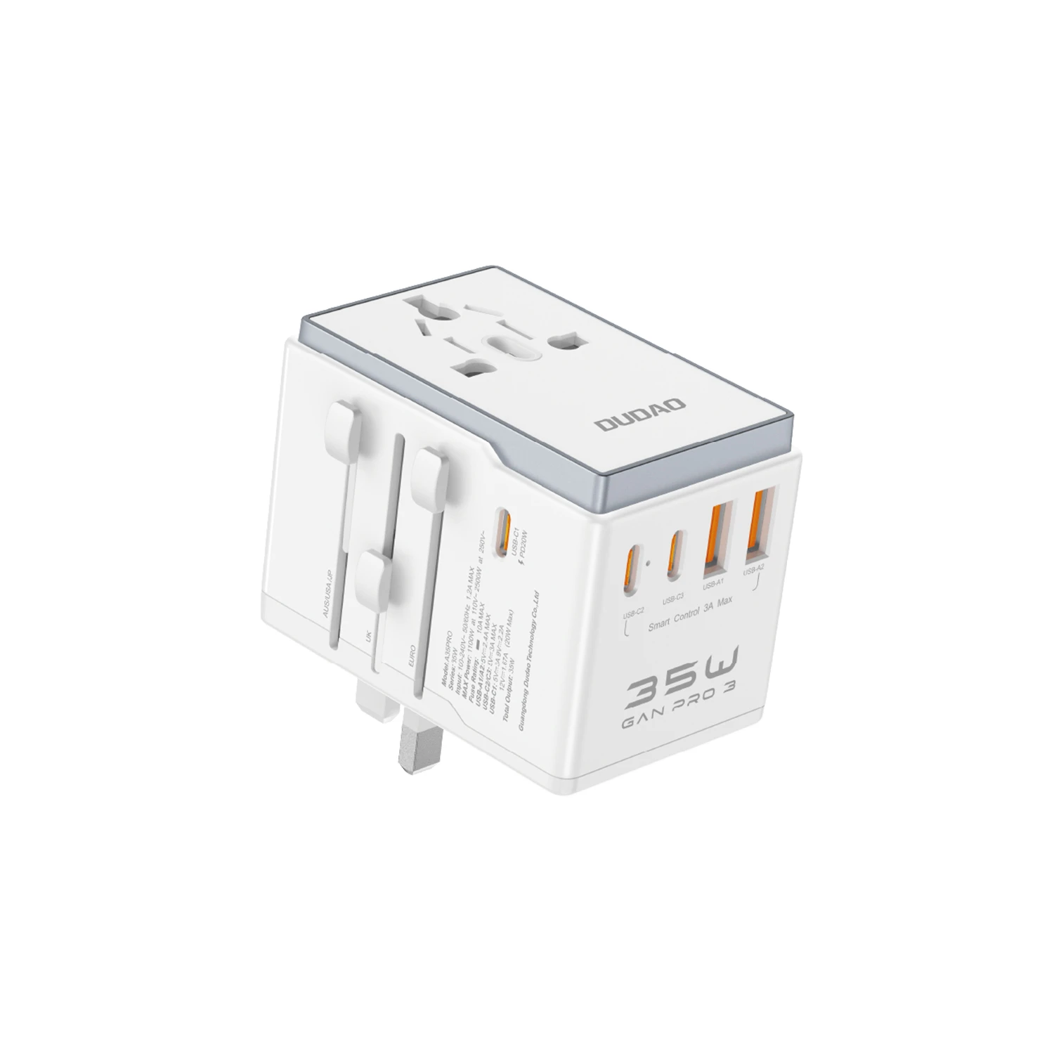 1. unniversal traval charger2. Wide-range voltage compatible for multiple countries,compact and portable design3. 3 USB-C+2 USB-A output4. Max 35W output